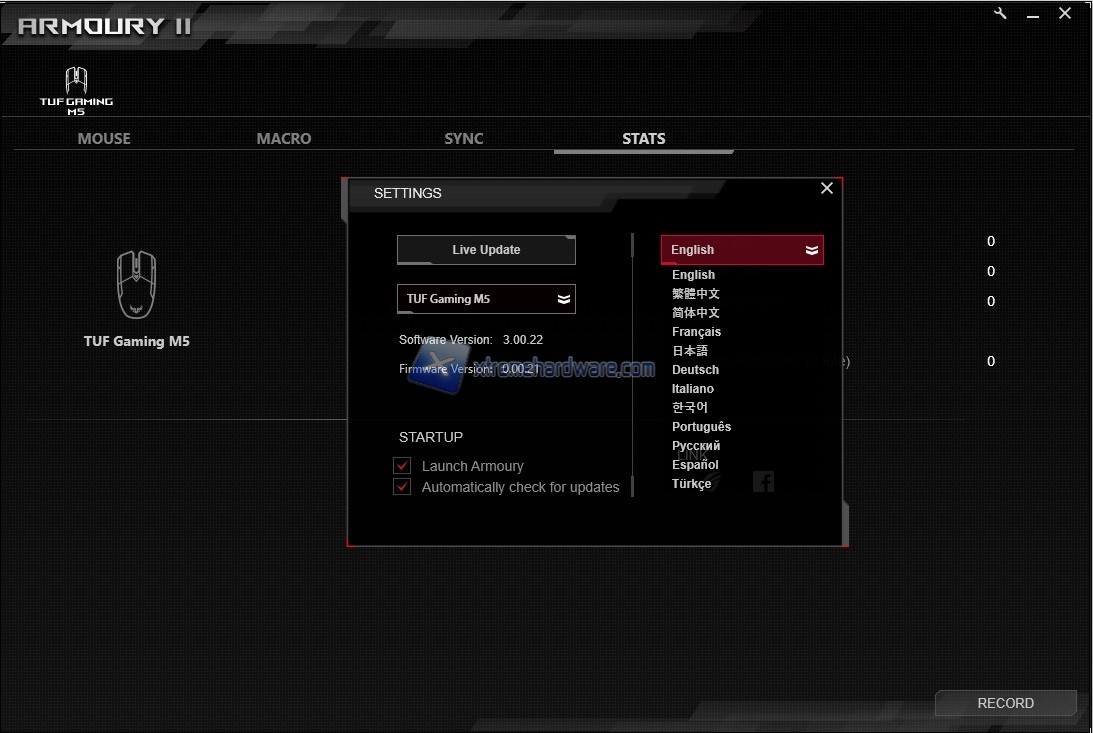 A seguire vi lasciamo tutti gli screenshots delle impostazioni e menu che avremo a disposizione una volta collegato il mouse TUF Gaming M5. Ormai conosciamo e conoscerete bene come è strutturato il software unificato di ASUS ROG Armoury II.
