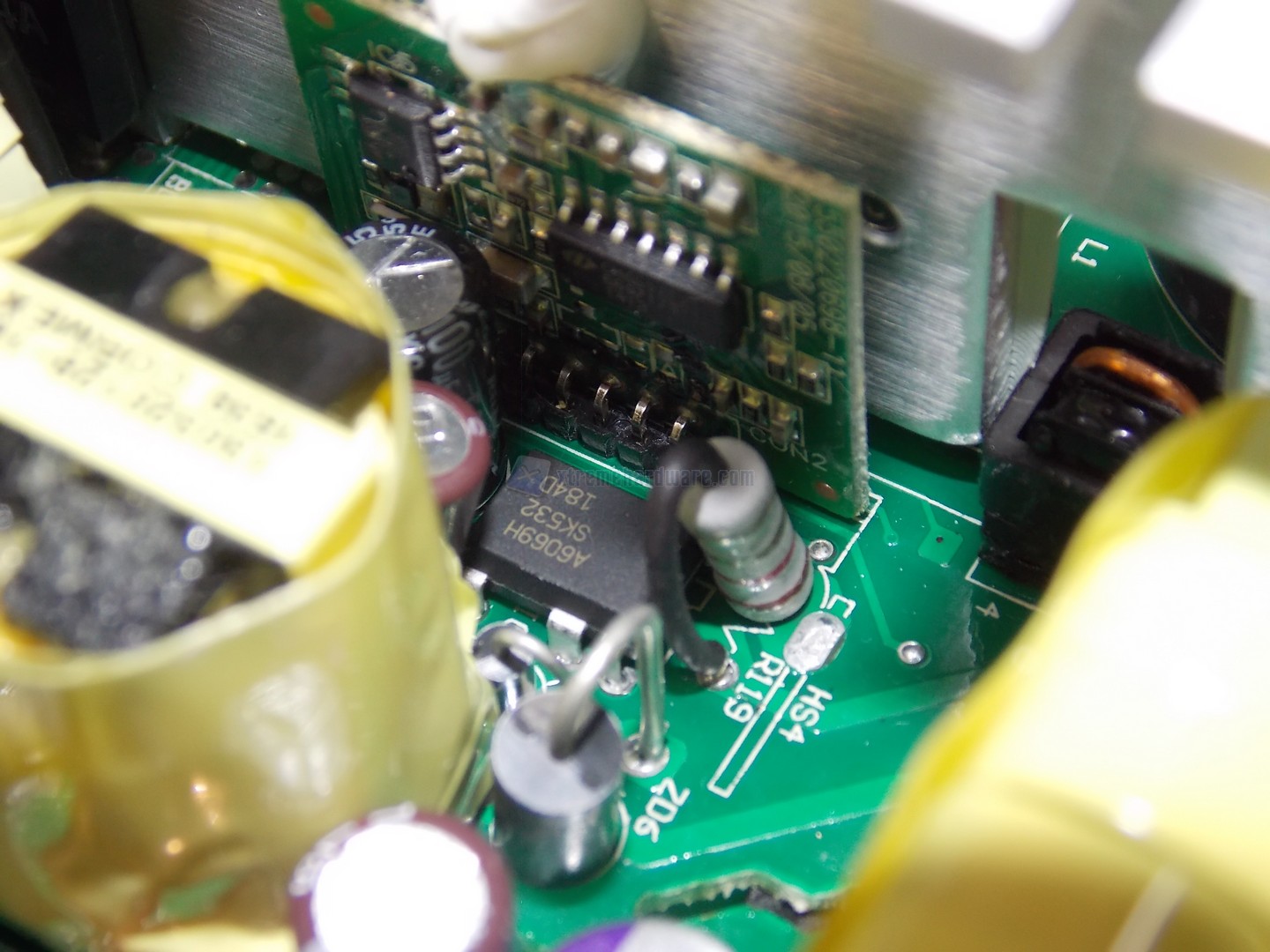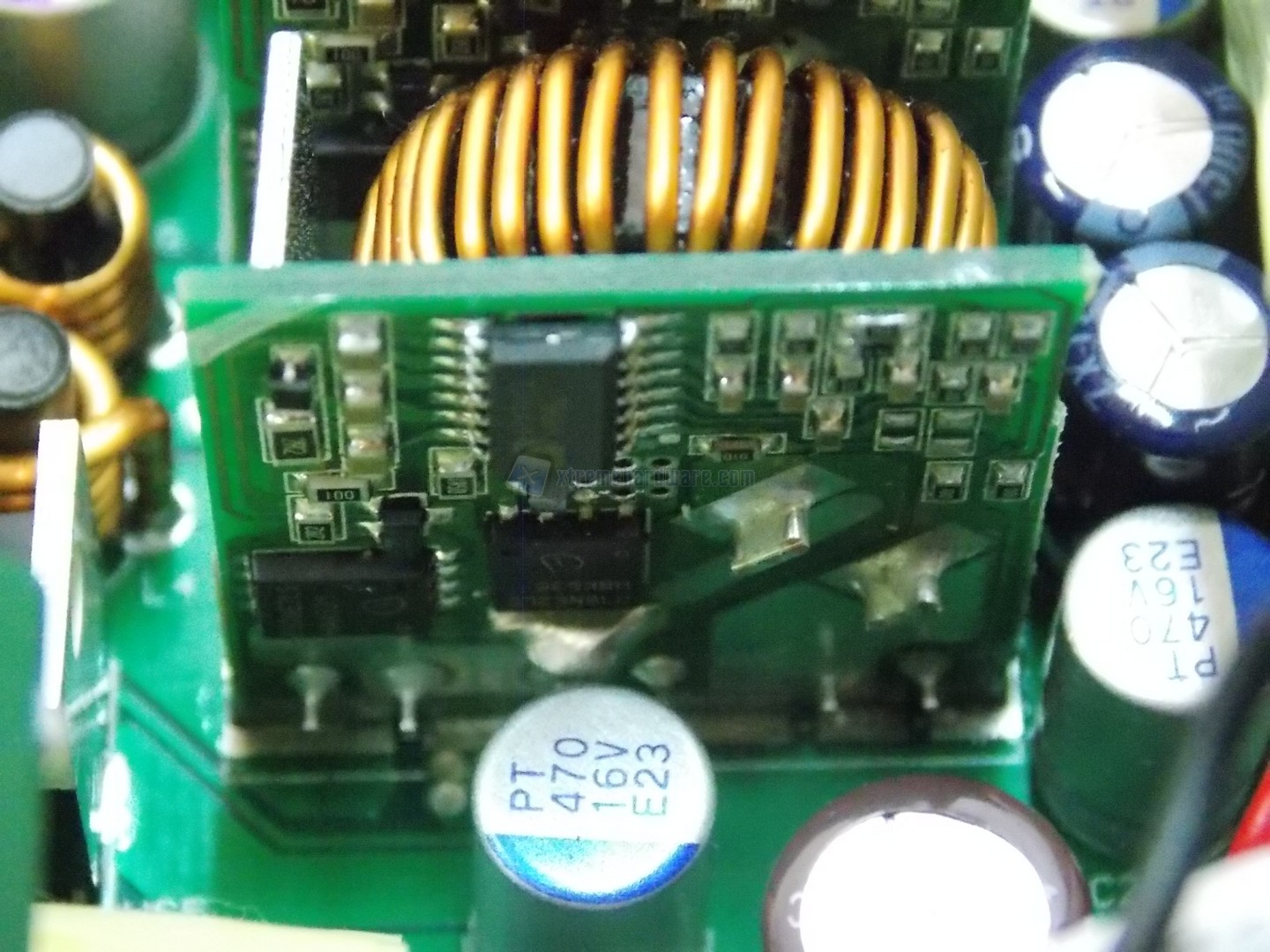 Nel secondario, accanto al dissipatore anteriore, troviamo una vecchia conoscenza, l'IC PFC Champion CM6502TX, montato su una daughterboard specifica.
