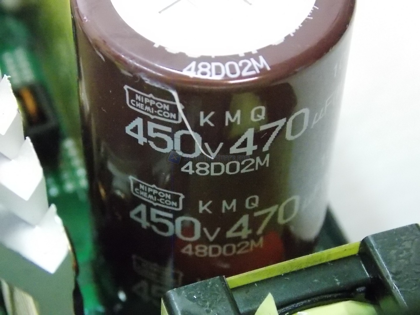 L'inclusione di un diodo TVS, rispetto al MOV, è in funzione della tipologia di voltaggio e dei microcontrollori utilizzati, poiché come riportato dagli studi effettuati dal portale powerelectronics.com in casi di stadi ad elevato voltaggio DC sarebbe piùindicata la presenza di MOV, anche se qeusti ultimi, rispetto ai diodi TVS, comportano un range potenziale di failure più eterogeneo, per quanto limitato dai circuiti di protezione a monte e a valle. Particolare del condensatore Nippon Chemi-Con da 450V e capacità di 470uF (MicroFaraday):