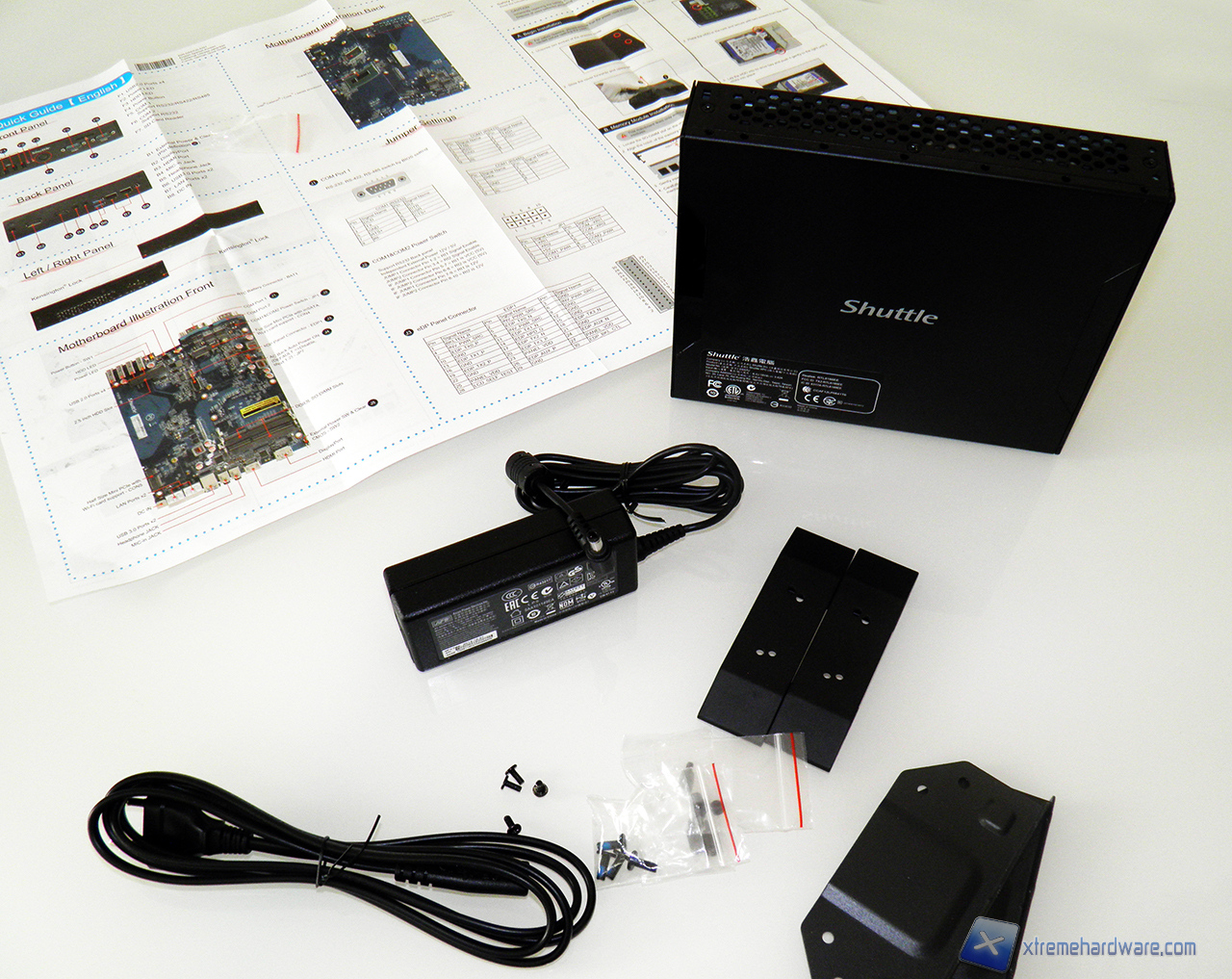 All'interno troviamo ben riposto lo Shuttle DS57U e parecchi sacchettini contenenti viti e staffe per i vari montaggi. È una confezione tutto sommato ricca, gli adattatori per il montaggio VESA non sempre sono forniti in dotazione con gli altri Slim PC.