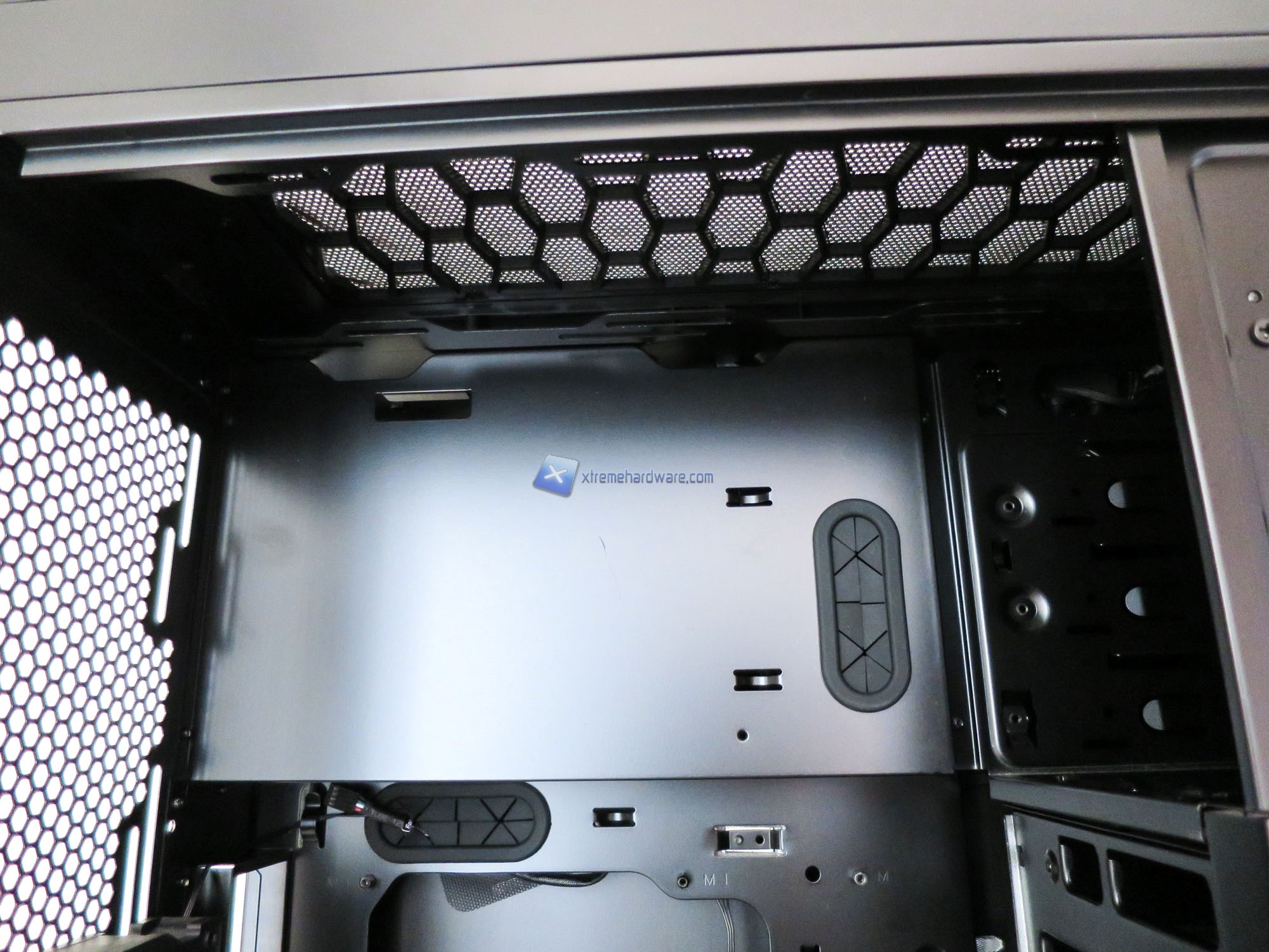 Sempre nella zona superiore troviamo una sorta di Midplate laterale che separerà la zona PSU dal resto dei componenti. Osserviamo come sia presente un foro per il passaggio dei cavi in quanto con il già citato Kit di espansione potremo creare una duplice configurazione all’interno del case. Tale caratteristica per un prodotto di questo genere possiamo dire che è davvero rara e inconsueta ma a tutto vantaggio della personalizzazione e fantasia dell’utente finale.