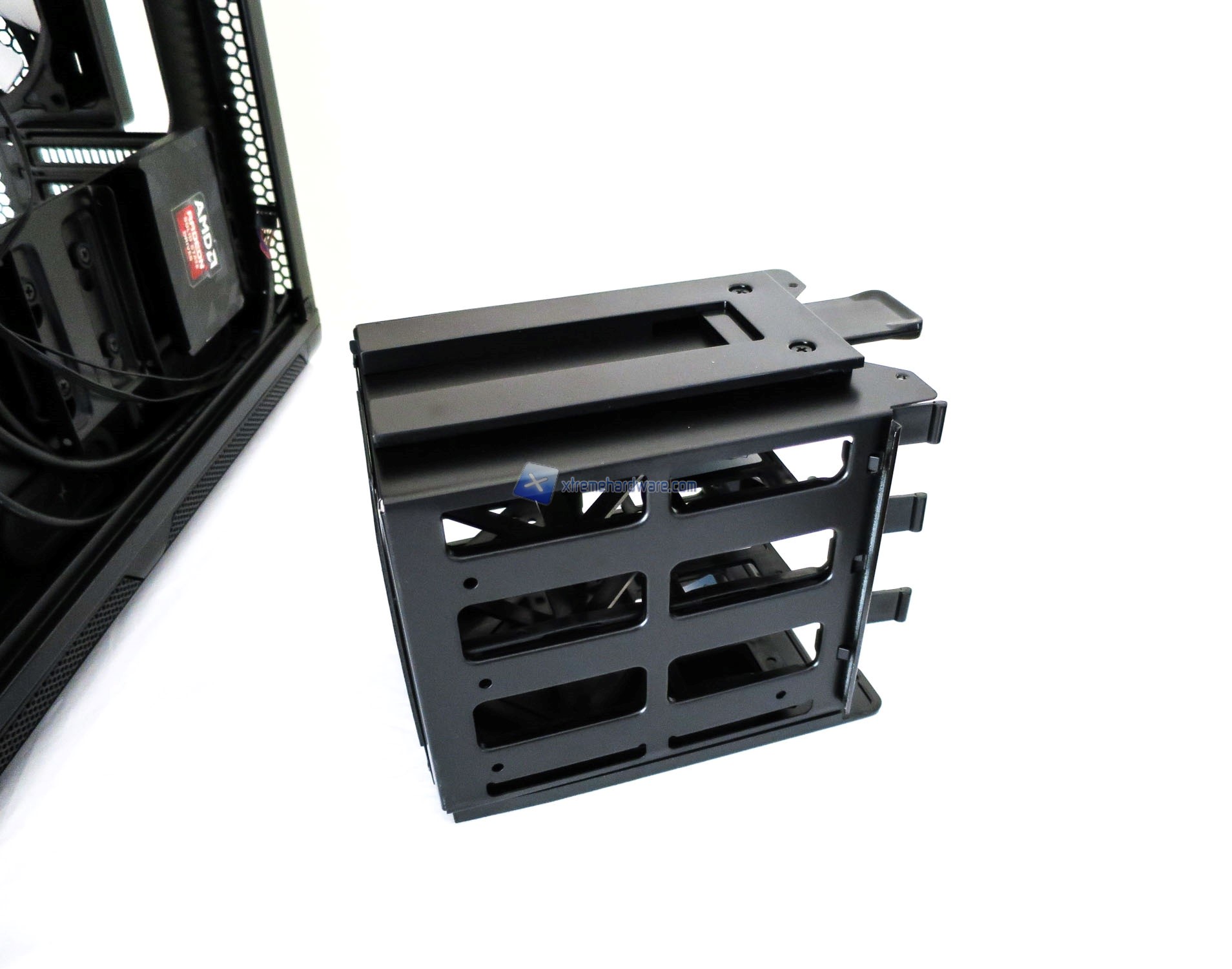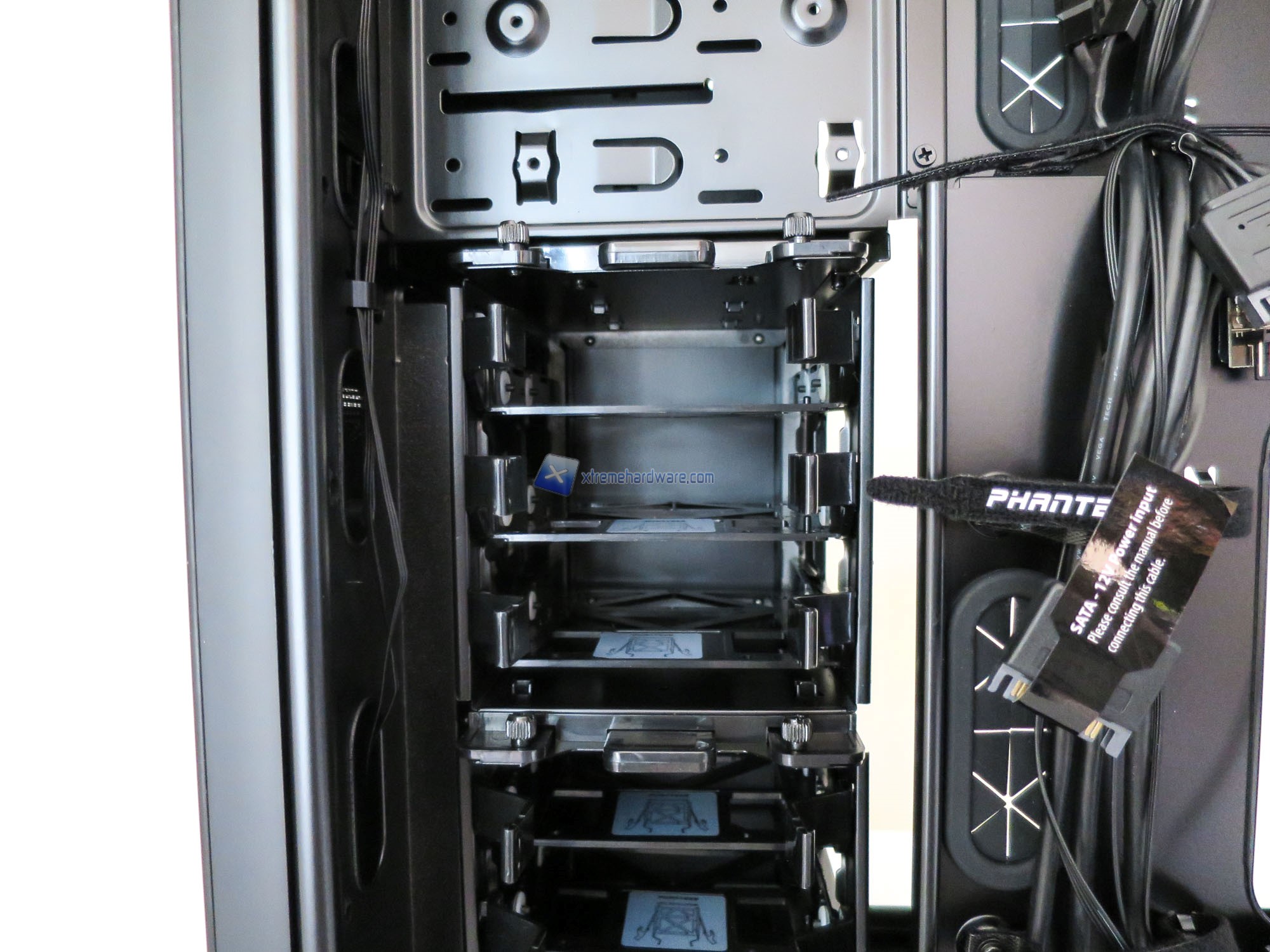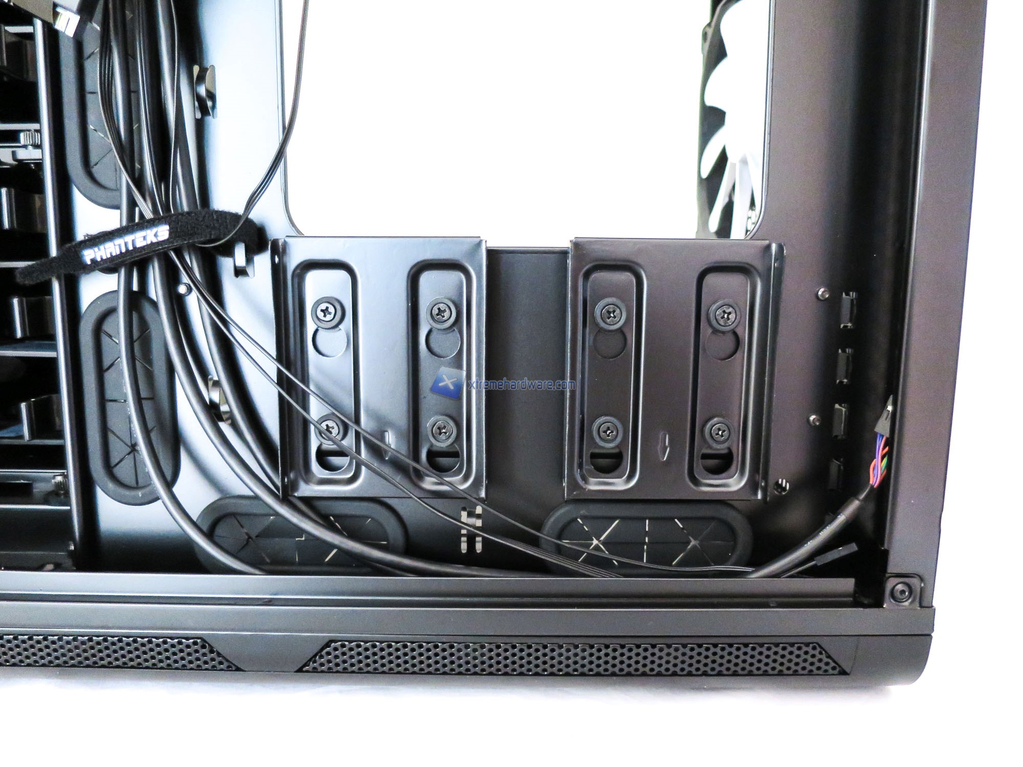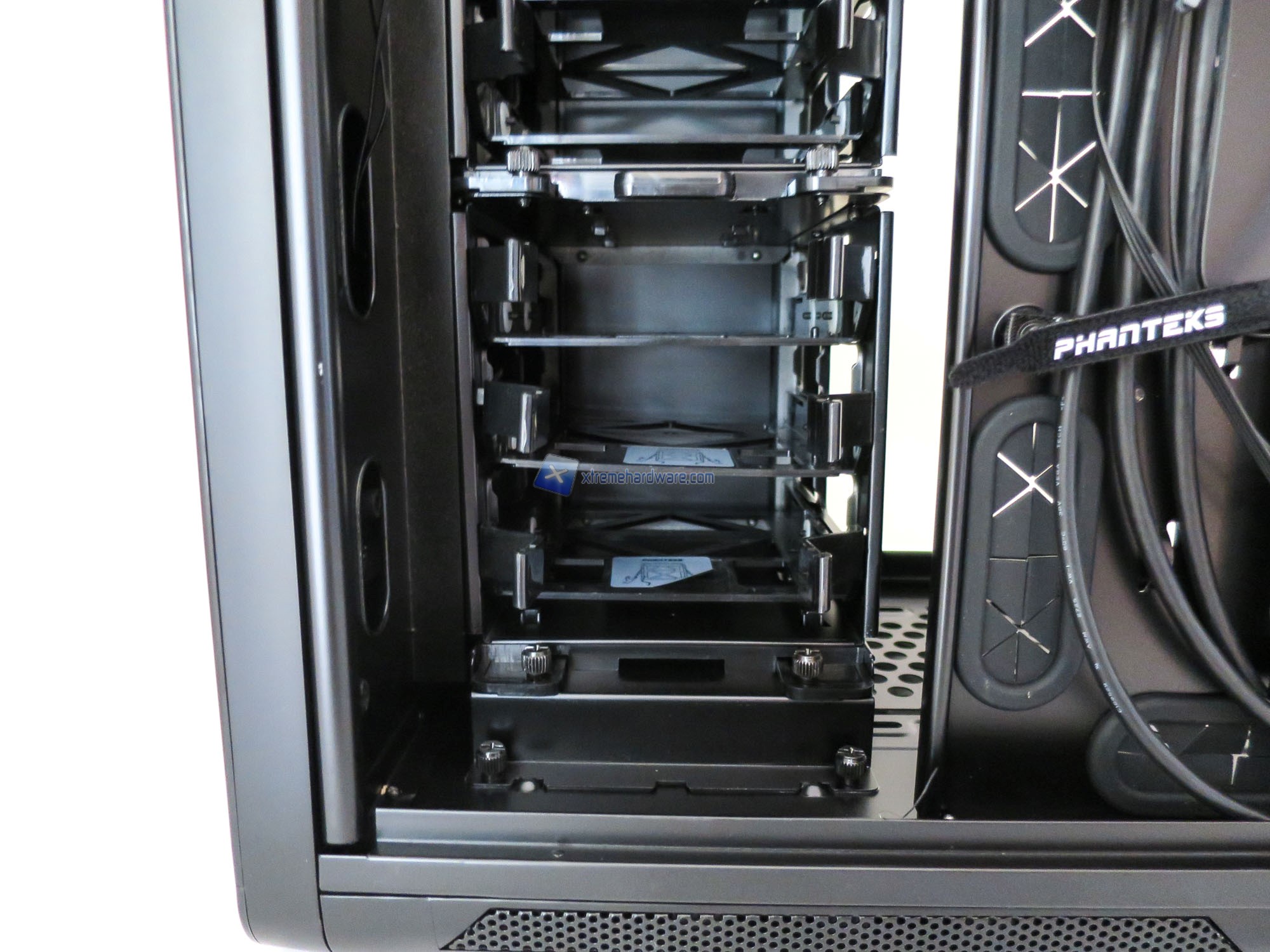 A lato di tali fori trova posto la struttura che ospiterà i due cage per Hard Disk removibili. Tale struttura nel lato frontale interno ha anche una cover con la targhetta Phanteks che rende non solo pulito il design ma completa anche la qualità generale del prodotto già di per se ottima. Essendo un po' tutto il case ‘’modulare’’ potremo facilmente rimuovere tale cover nel caso non vi piaccia (tramite pratiche viti laterali).