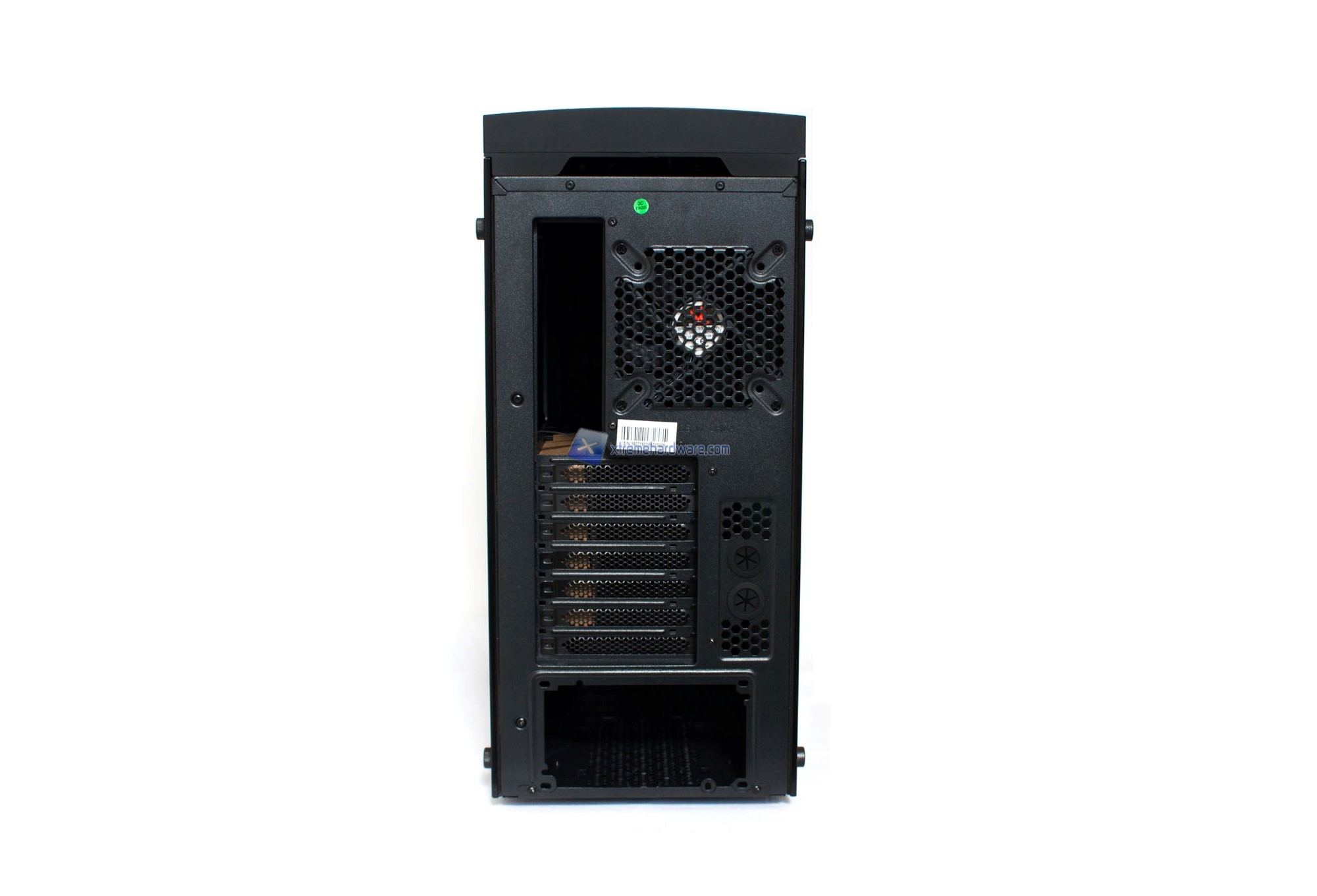 Arriviamo dunque al retro del case. Nulla di nuovo anche qui. Troviamo il classico layout e disposizione per l’I/O Shield della scheda madre, 7 Slot PCI-E con a lato due passatubi in gomma e infine il foro per l’alimentatore.