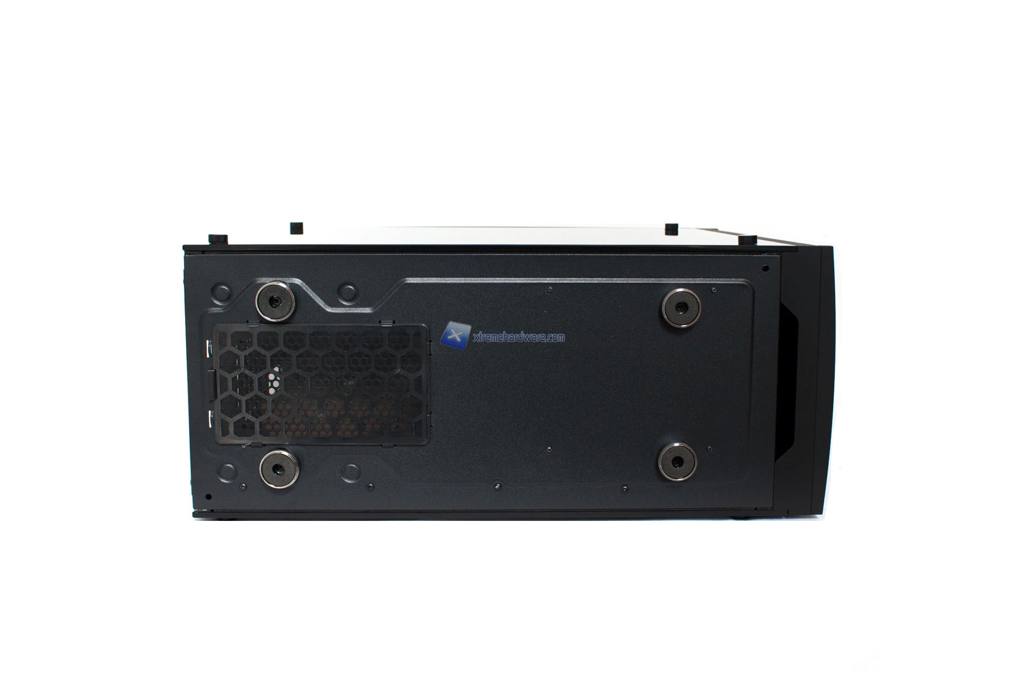 Capovolto il case invece troviamo il classico filtro antipolvere removibile in corrispondenza della ventola dell’alimentatore e quattro piedini in plastica a stabilizzare il peso del case (circa 11 Kg) dato dai due pannelli laterali in Vetro Temperato.