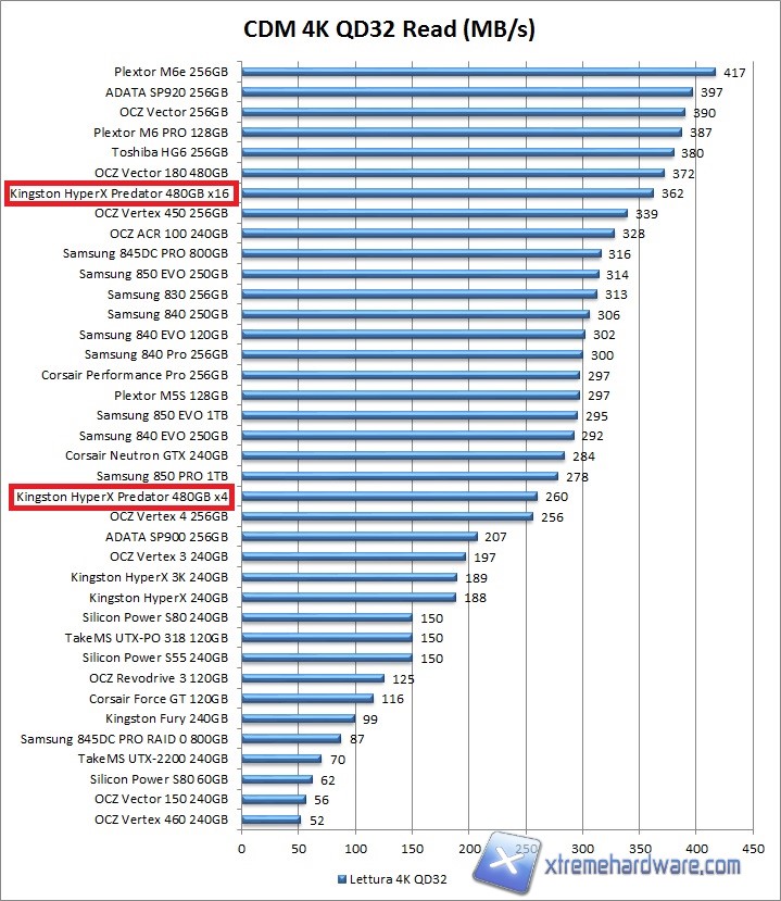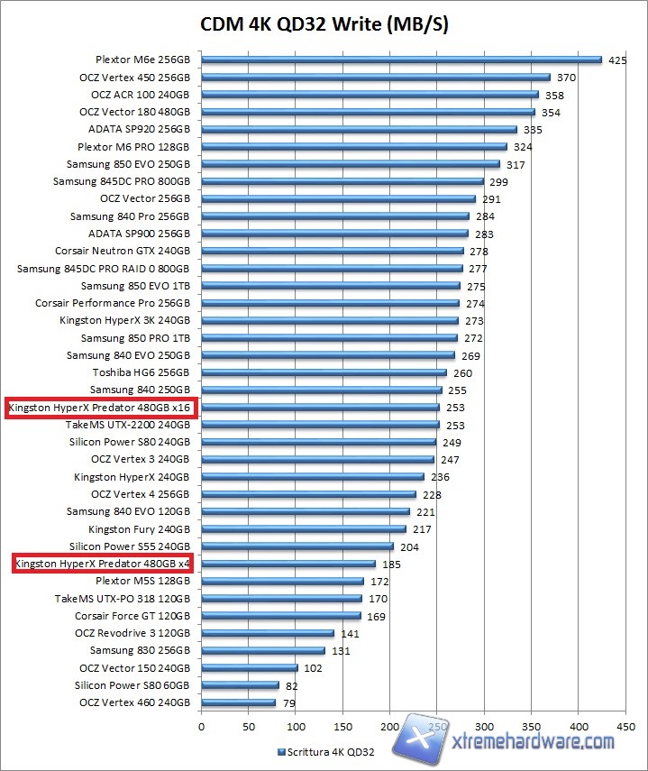 Come possiamo vedere dal confronto, anche sulla nuova versione si hanno importanti miglioramenti delle prestazioni del Kingston HyperX Predator in 4K QD32 spostandoci su uno slot PCIe 3.0 x16 gestito dalla CPU. Il chipset Z97 introduce importanti latenze, anche se l'utilizzo di uno slot della CPU ci porterà a dimezzare la banda a disposizione della scheda grafica.