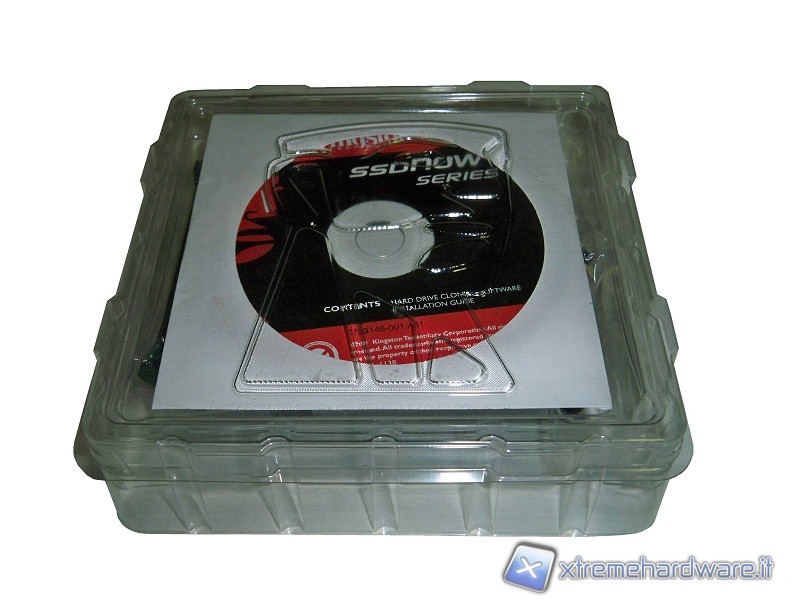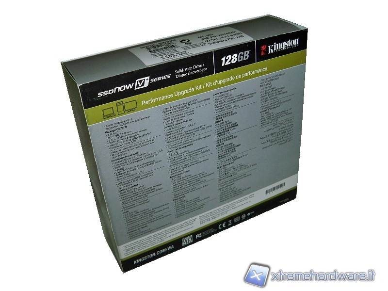 La confezione riporta il volto stilizzato rosso, caratteristico del logo Kingston e il nome del modello; “Performance upgrade kit” sta ad indicare che è la versione del drive completa di accessori. Sul retro sono riportate alcune caratteristiche tecniche del prodotto.