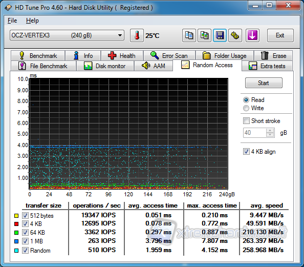 Per quanto riguarda i tempi di accesso al disco, questo test effettuato in modalità random rivela un’incredibile rapidità di accesso soprattutto sull’interfaccia SATA 3Gb/s.