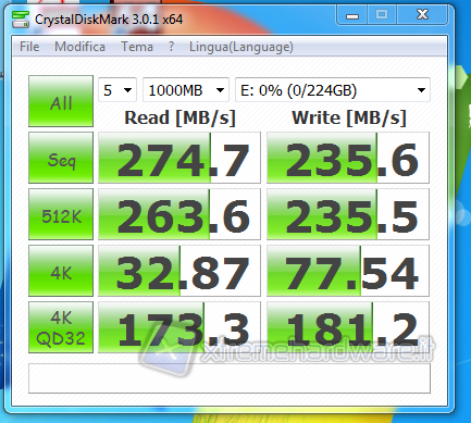 Questo benchmark è utilissimo per misurare la scrittura/lettura sequenziale (sequential) e casuale (random), CrystalDisk Mark supporta infatti pienamente il NCQ (Native Command Queuing) che consente al disco di determinare l’ordine ottimale degli IOPS massimizzando così le prestazioni di Input/Output con una Queue Depth (file in coda) di 32 (test che consente di osservare il comportamento del drive sul trasferimento di numerosi file di dimensione ridotta).