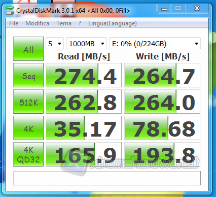 Negli screenshot seguenti possiamo osservare l’impressionante velocità di lettura sequenziale di questo drive sull’interfaccia Intel SATA 6Gb/s (518MB/s) che si avvicina a quanto dichiarato dalla casa produttrice, risultati corroborati anche dal test effettuato in modalità 0-fill.